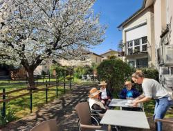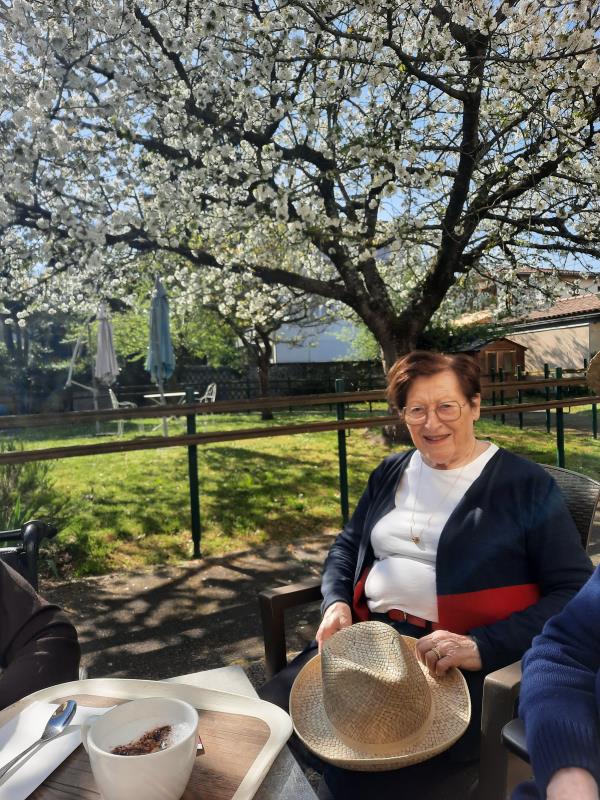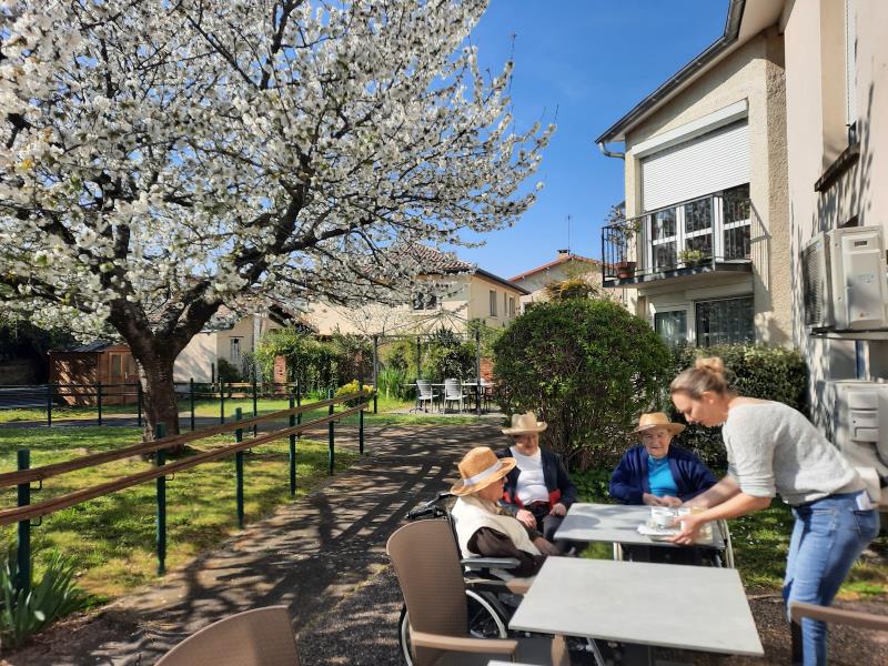 La saison s'y prête... pour les résidents qui le souhaitent, nous proposons en ce moment la lecture du journal et le goûter sous le cerisier. Nous entendons le bourdonnement des abeilles qui travaillent alors que nous nous reposons au soleil... un délice !