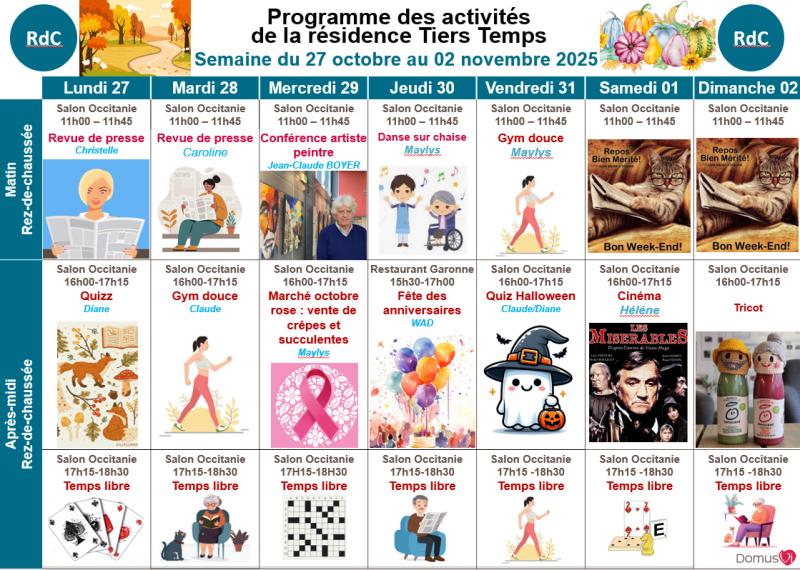 le planning est là, tout chaud, tout beau ! 3 temps forts où les familles sont conviées: notre marché au profit d'octobre rose (vente de boutures de succulentes faites par les résidents et crêpes), les anniversaires du mois et la conférence du peintre Jean Claude Boyer. A très bientôt !