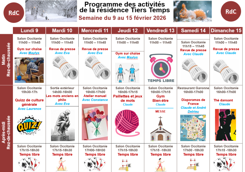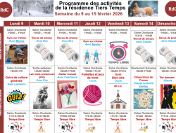 Résidence Tiers Temps > Actualités > Programme Programme Publiée le 09/02/2026 Bonjour à tous, après un agréable week-end, nous entamons une nouvelle semaine : le programme est en pièce-jointe :) Bonne semaine à tous !